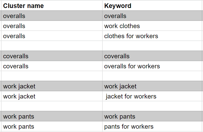 Trabajar con una gran lista de palabras clave es incómodo. Normalmente se compilan en grupos en función de una serie de atributos y se trabaja con el grupo por separado. Una lista de grupos de palabras clave puede ayudarle a entender qué secciones son importantes en el sitio, optimizar la estructura.
